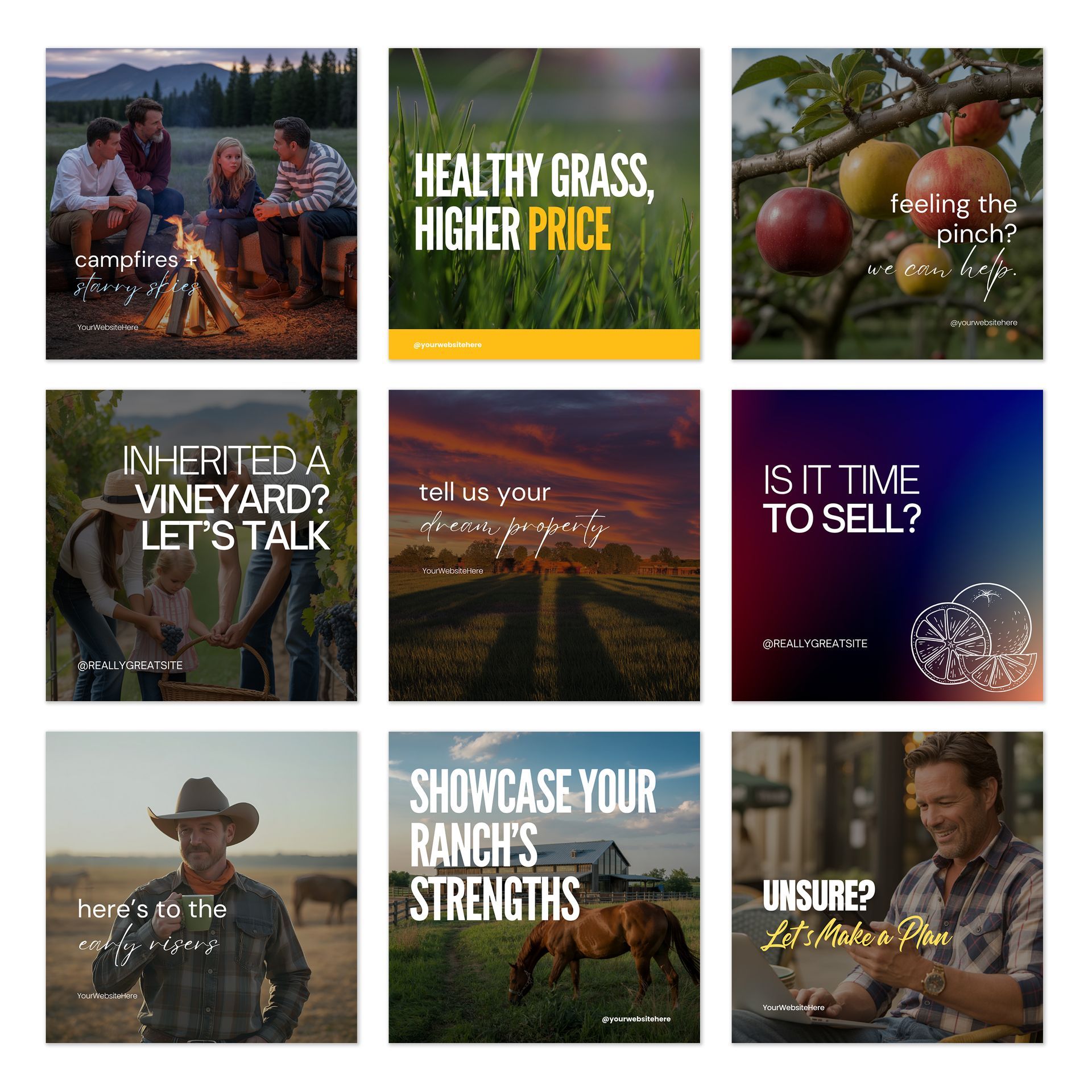 You get access to hundreds of ready-to-use posts and stock images for land brokerage, including:
